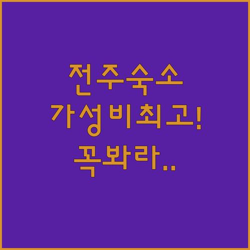 숙소명 주요 특징 및 매력 포인트 예약/제휴 링크 글로스터호텔 전주(4성급) 프리미엄 위치: 쇼핑 중심가(객사길) 바로 옆, 한옥마까지 도보 약 20분. 풍부한 부대시설: 24시간 피트니스 센터, 1층 GS25 편의점, 옥상 정원. 편안한 안락감: 객실 안락함 및 쾌적성 항목 투숙객 평점 9.0의 우수한 평가. 가족 여행 추천: 패밀리룸, 무료 주차, 24시간 프론트 서비스로 가족 단위 여행에 적합. … 더 읽기